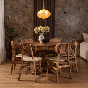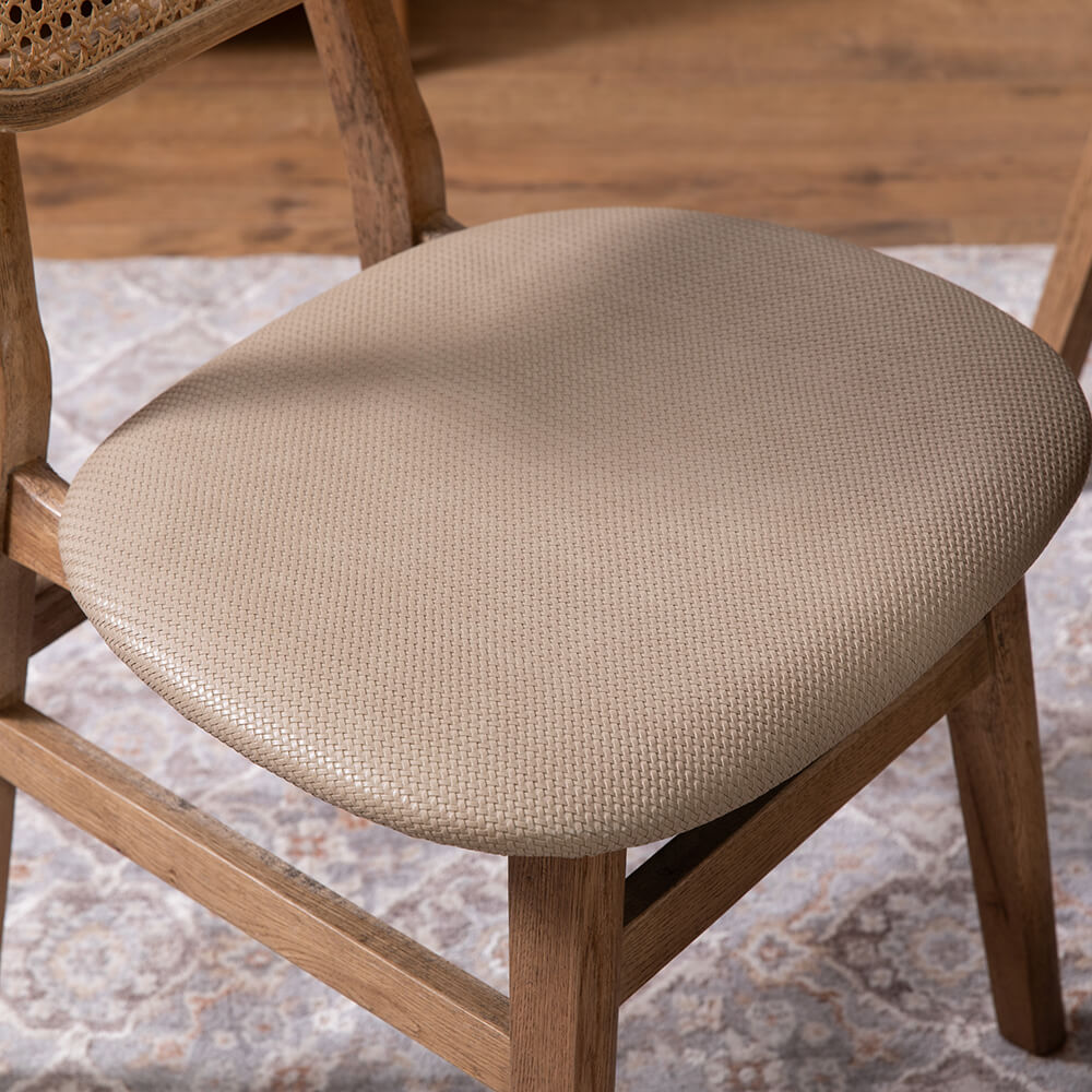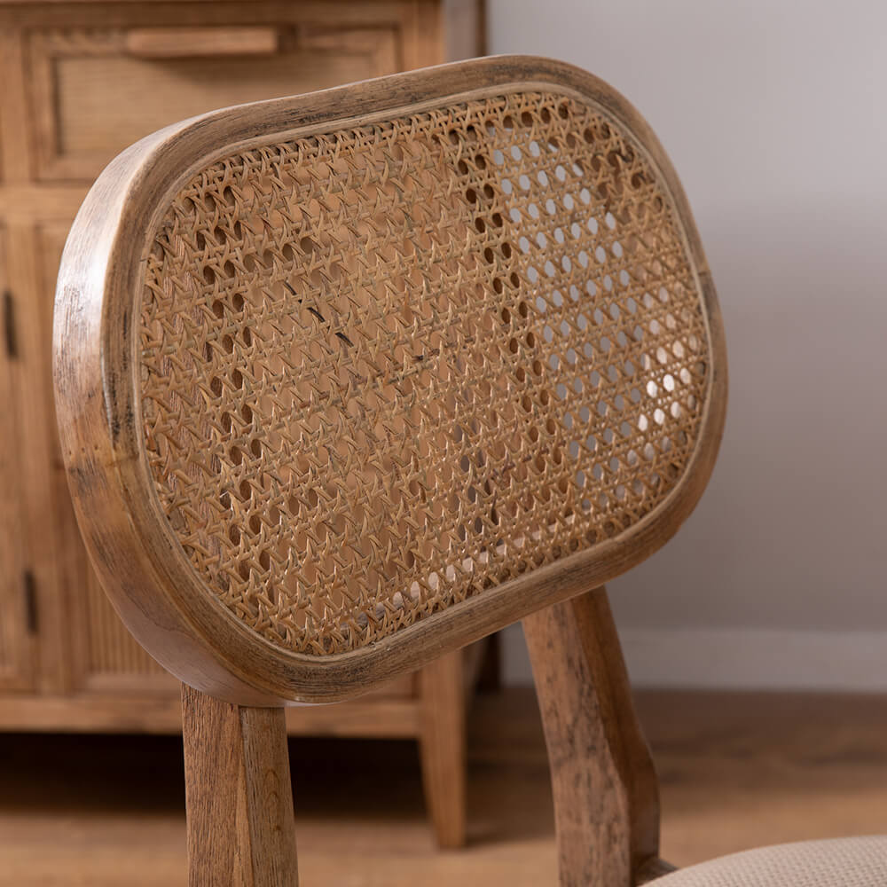 כסא אוכל כפרי דגם דיאגו עשוי עץ מלא בגוון טבעי, עם משענת גב מראטן טבעי המעניקה מראה חמים ואותנטי. המושב מרופד לנוחות מרבית ומגיע בצבע פנינה, עם אפשרות לבחירה גם בגווני ירוק או חום. עיצוב נקי וייחודי המשתלב בהרמוניה בחללי אוכל כפריים וגם מודרניים.