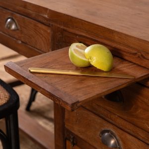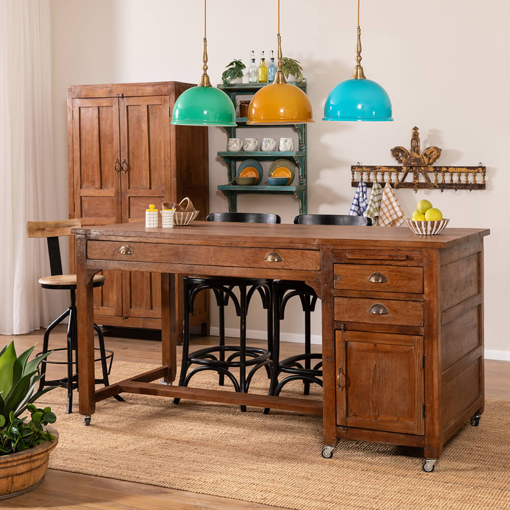 מחפשים תוספת של מקום עבודה למטבח הביתי או לחלל מסחרי? אי בסגנון וינטג’ על גלגלים דגם 047 יכניס לכם אופי ועניין לחלל. אי למטבח על גלגלים מקולקציית One Piece. מידות: 170/85 ס”מ. עשוי מעץ טיק, בעל גוון חום עשיר ויפה, כולל מגירות וארון. מתאים לעד 4 סועדים.