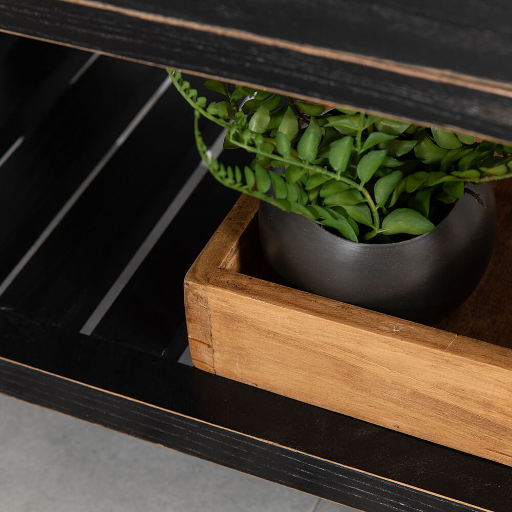 ארון אמבטיה קטן בסגנון כפרי מעץ מלא בצבע שחור עם דלתות זכוכית פסים ומגירת אחסון. הארון באורך 60 ס”מ, עשוי מעץ אלון ומתאים לחדרי אמבטיה קטנים, שירותי אורחים וכשידת כניסה לבית. קיים גם במידות שונות וצבעים נוספים: טבעי, תכלת, צהוב וכחול פחם.