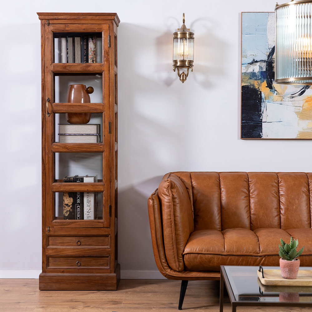 ארון ויטרינה צר מקולקציית One Piece. ארון בעל מראה עדין ומיוחד, עשוי מעץ טיק בשילוב זכוכיות. הארון יתאים לסלון, לפינת האוכל ולכל פינה שרק תרצו להציג כלים, אוספים ועוד.