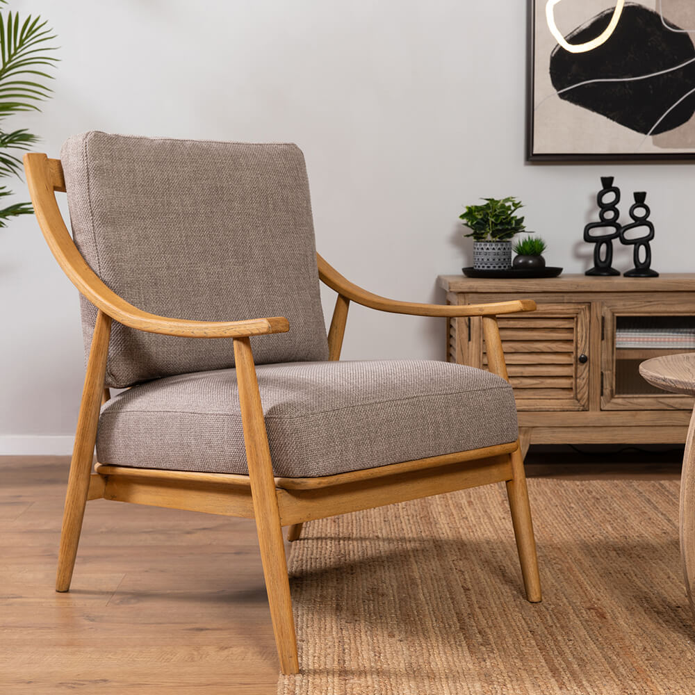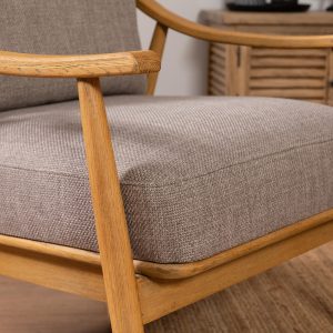 כורסא מעוצבת בסגנון רטרו דגם הלנה בצבע חום אפרפר. כורסא מיוחדת עם ידיות מעוגלות מעץ מלא בשילוב בד 100% סינטטי איכותי ונעים למגע. כורסא רחבה ונוחה במיוחד. מתאימה לסלון, לחדר שינה, לקליניקה ועוד. קיימת בצבעים נוספים: אבן, אפור עכבר, ירוק מנטה, ירוק בקבוק, אבן, חרדל, אופווייט וגם בעור חום.