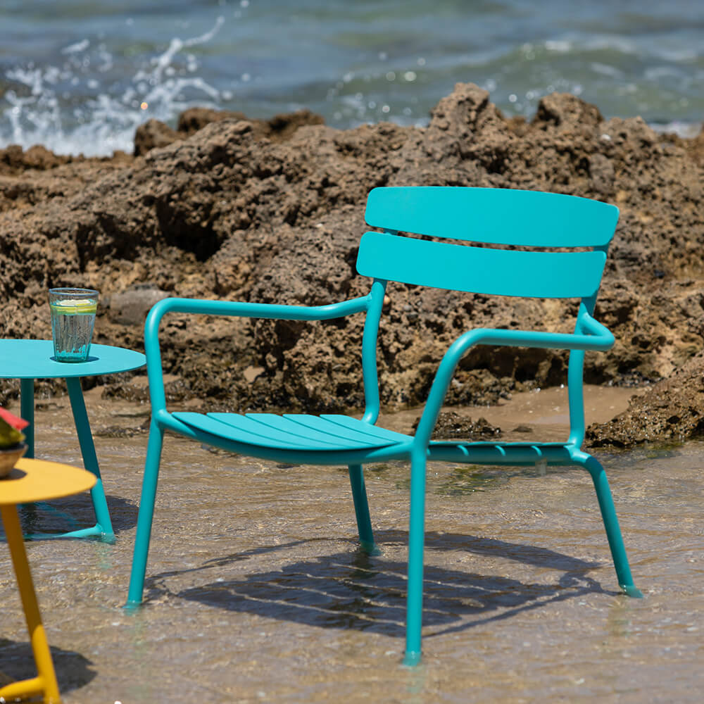 כסא אלומיניום מדגם רויאל (Royal) בצבע טורקיז הוא הכסא המושלם לפינת קפה נמוכה. כסא גן אלומיניום רחב, נוח ואיכותי, במבחר צבעים שישתלבו בכל גינה או מרפסת. ניתן לרכוש שולחן אלומיניום קטן מלבני או עגול מסדרת Royal.