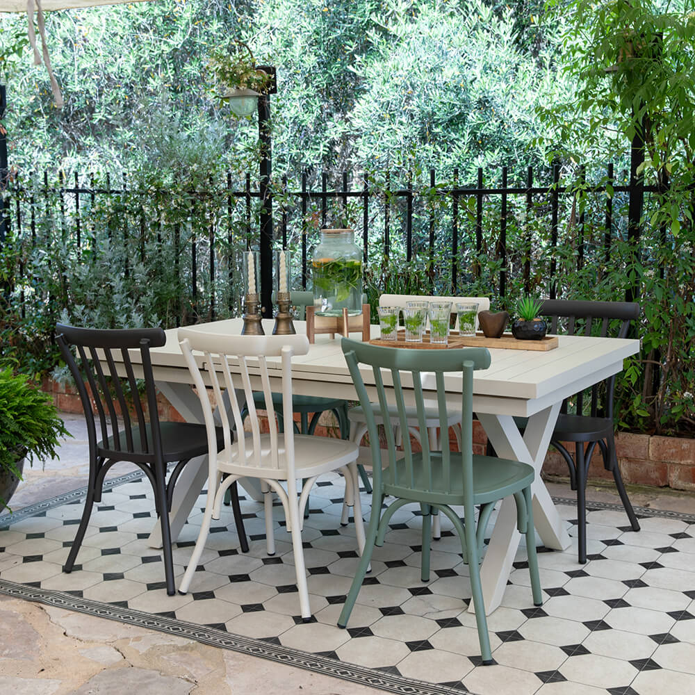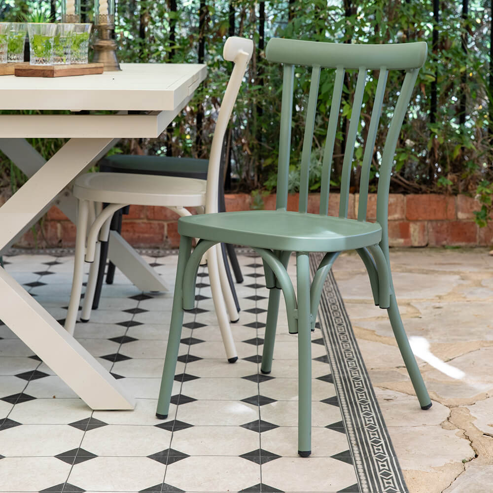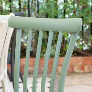 כסא אלומיניום צבעוני בסגנון רטרו כפרי דגם 4 פסים בצבע ירוק קקטוס. הכסא נערם, קל, נוח ועמיד בגשם ובשמש. קיים גם בצבעים: שמנת, אפור פחם, כחול רויאל, תכלת, צהוב וירוק. מתאים לשולחנות אלומיניום ושולחנות פסיפס. ייבוא בלעדי של טורקיז בית יצחק.