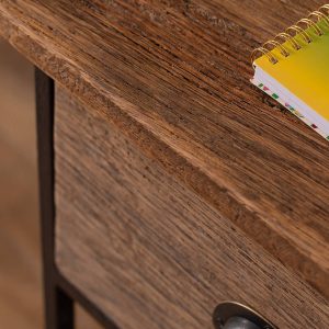 שולחן כתיבה כפרי בעיצוב נקי עם מגירה דגם הארי. השולחן באורך 140 ס”מ, עשוי מעץ אלון מעושן עם רגלי ברזל. לשולחן מגירה ו- 2 מדפים. מתאים לפינת עבודה ביתית.