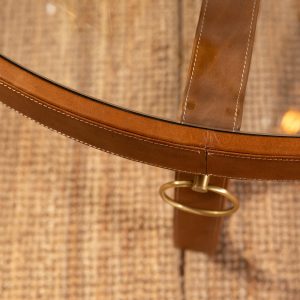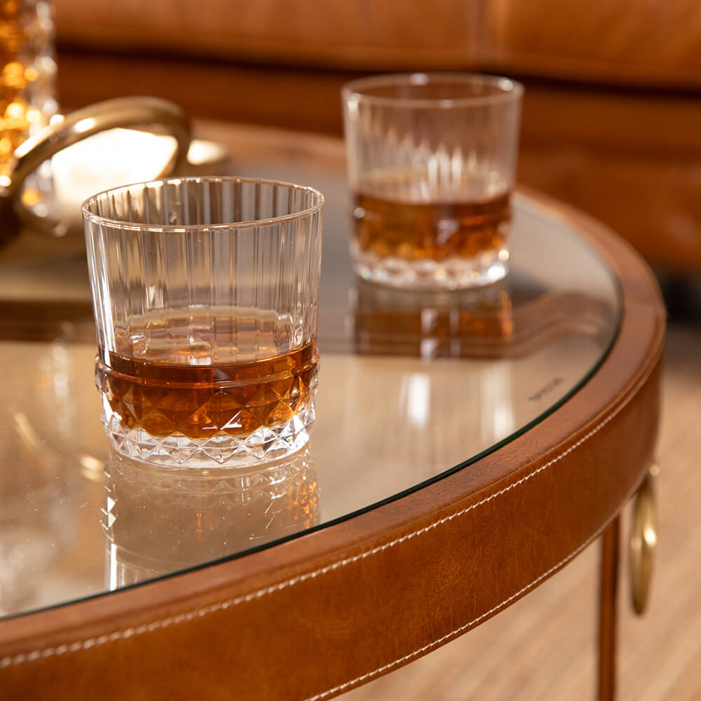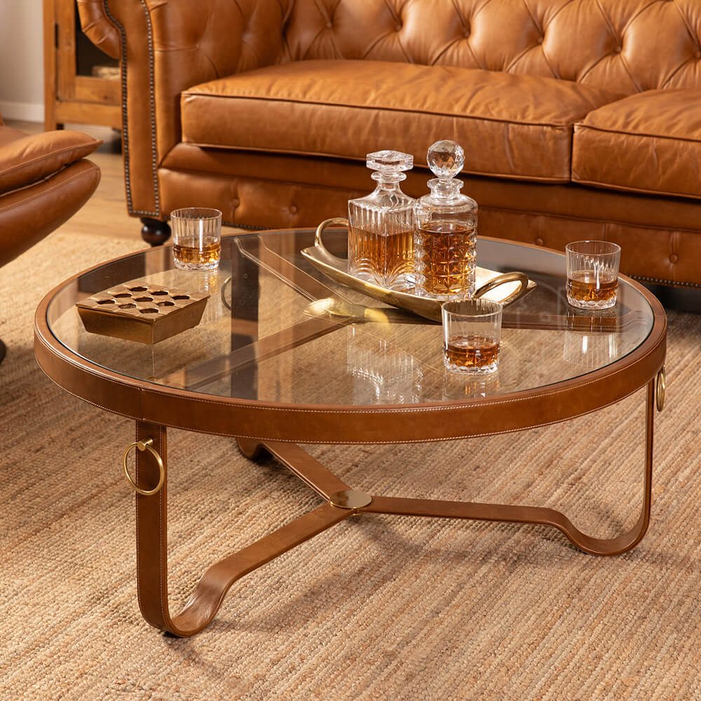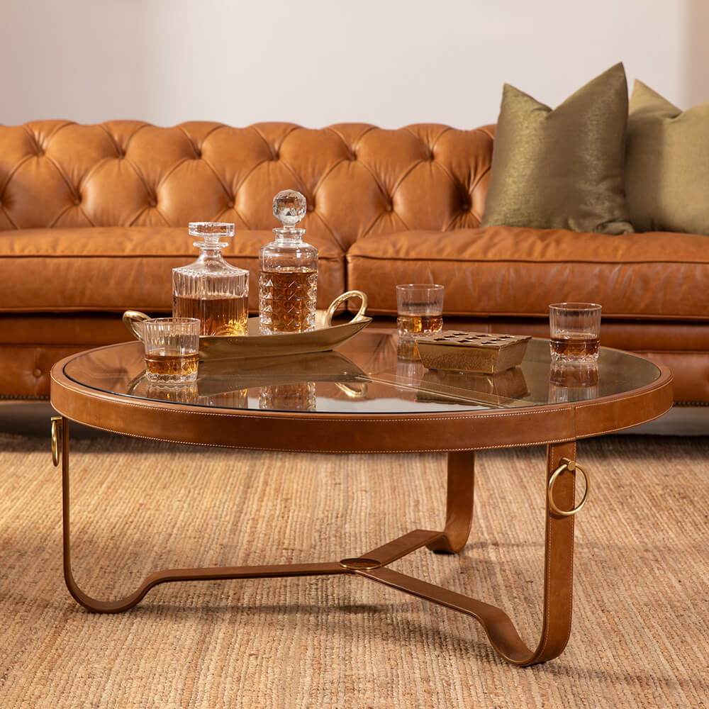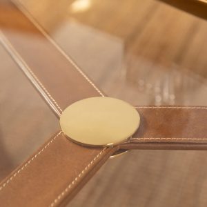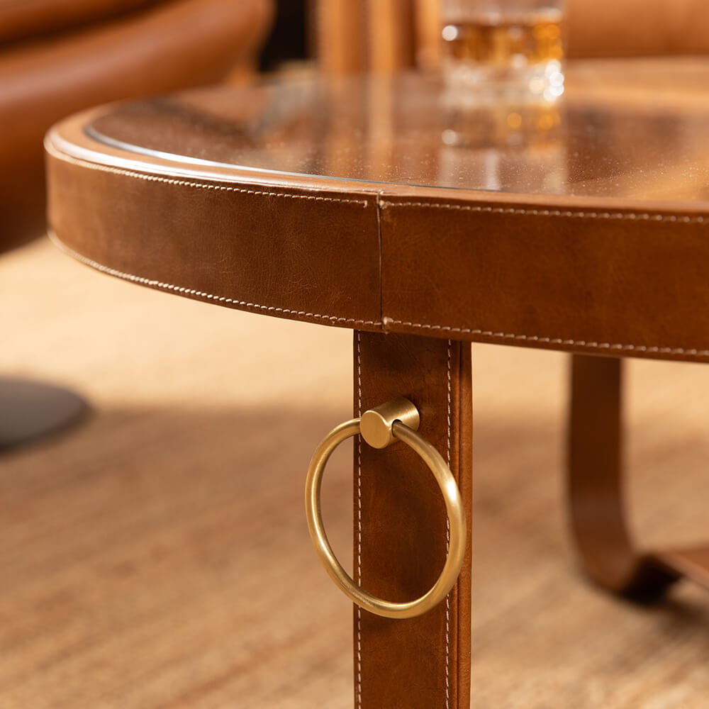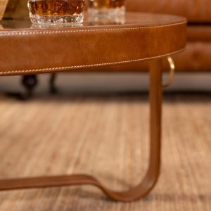 שולחן סלון עגול עם זכוכית דגם GOLD בקוטר 100 ס”מ. שולחן במראה יוקרתי עם קווים נקיים. לשולחן 3 רגליים מעוצבות ועטופות בעור אמיתי בגוון חום קוניאק, ובתוספת אלמנטים מפליז. במרכזו זכוכית מחוסמת. לשולחן זה קיים שולחן צד תואם.