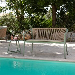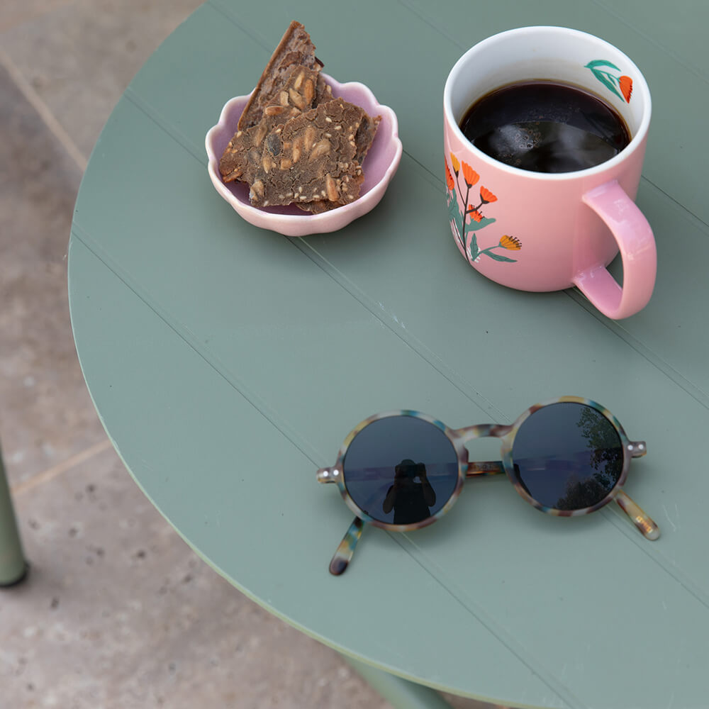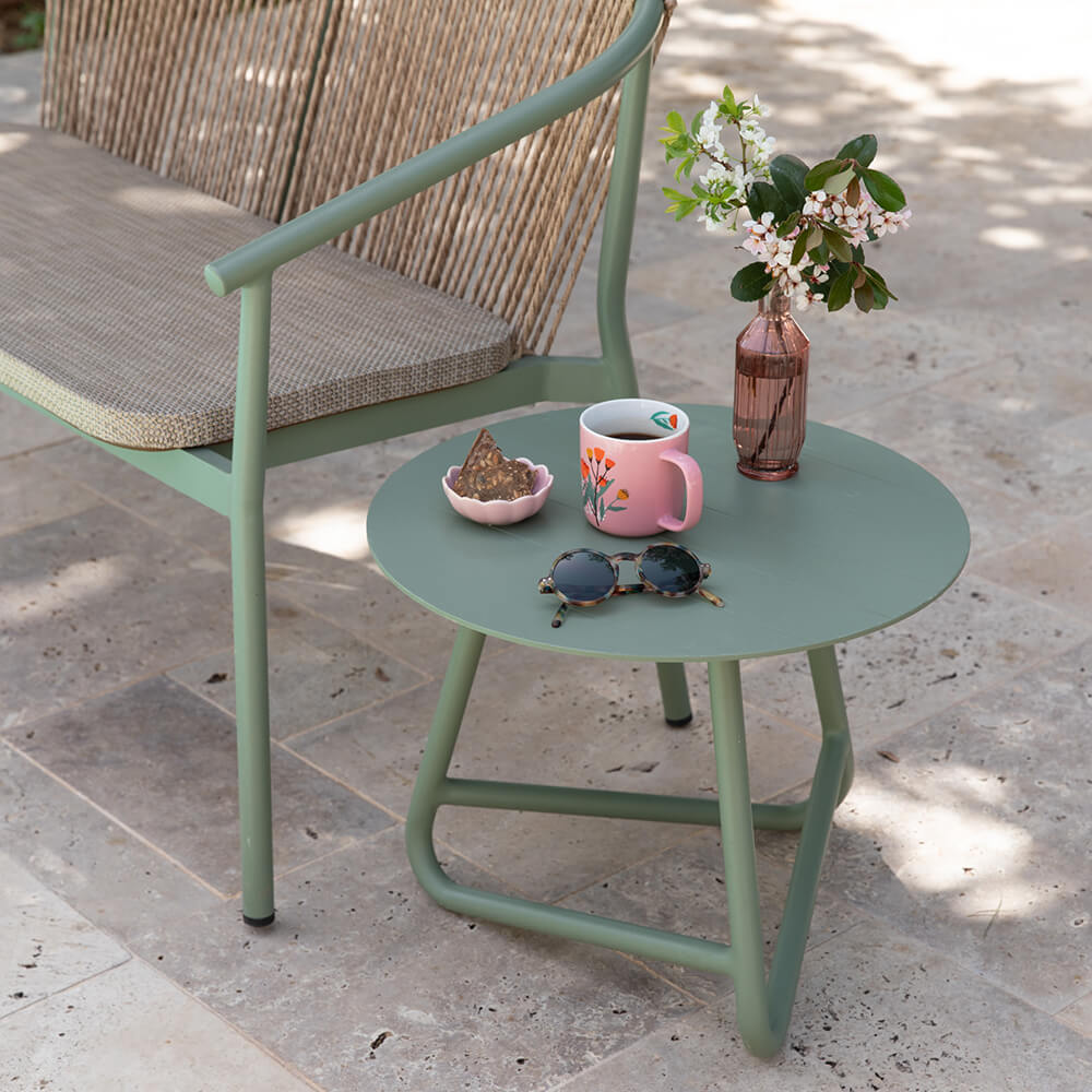 שולחן צד עגול קטן מאלומיניום דגם קופי בצבע ירוק קקטוס ובקוטר 50 ס”מ. מתאים לפינת קפה במרפסת או בגינה. השולחן עשוי אלומיניום ואינו מחליד – עמיד לכל תנאי מזג האוויר. לשולחן קיימים כסאות אלומיניום מעוצבים לגינה במבחר עיצובים וצבעים.