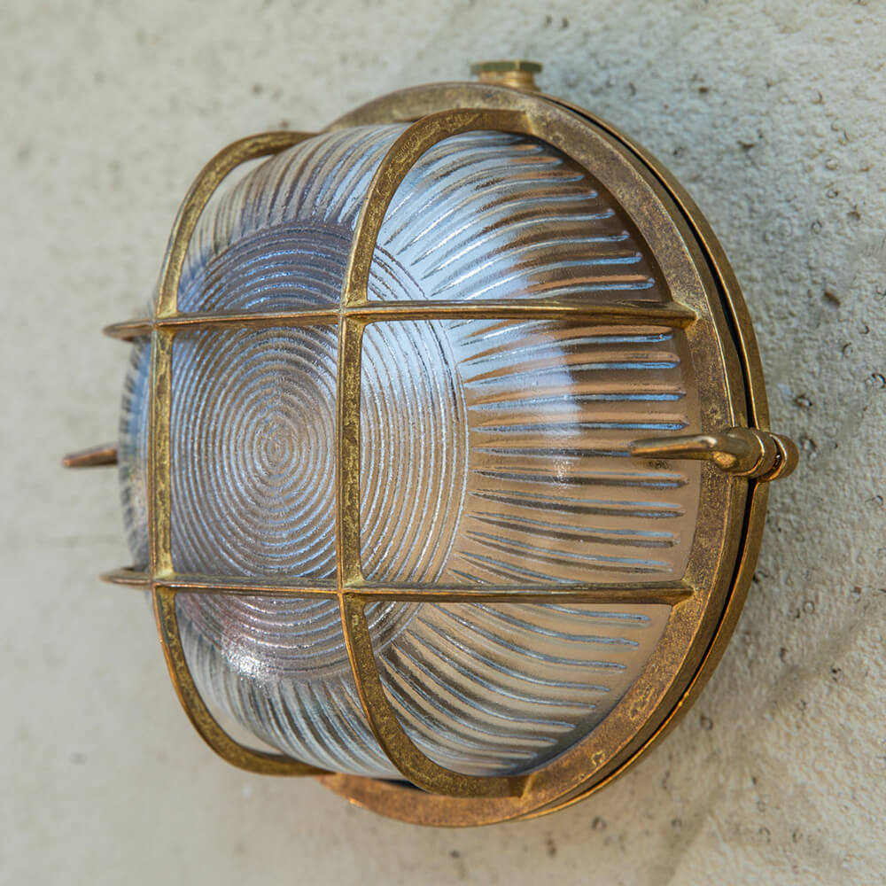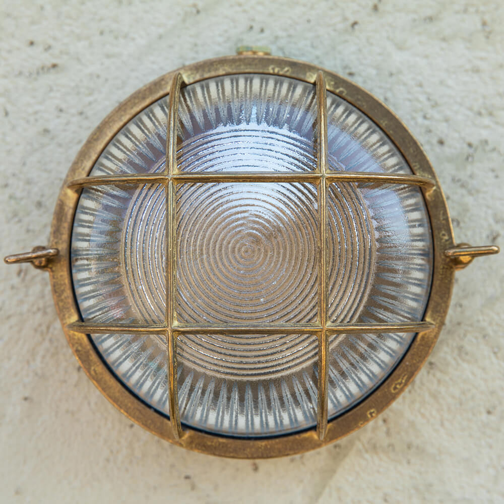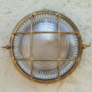 מנורת חוץ צמודת קיר מוגנת מים מקולקציית הימאים דגם POPEYE. המנורה עשויה כולה מפליז בקוטר 17.5 ס”מ. נורת E27 והספק 60W.